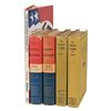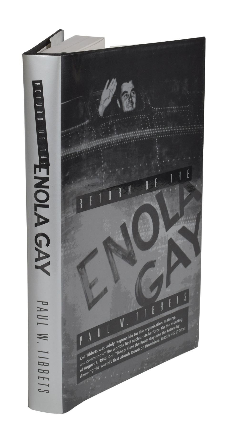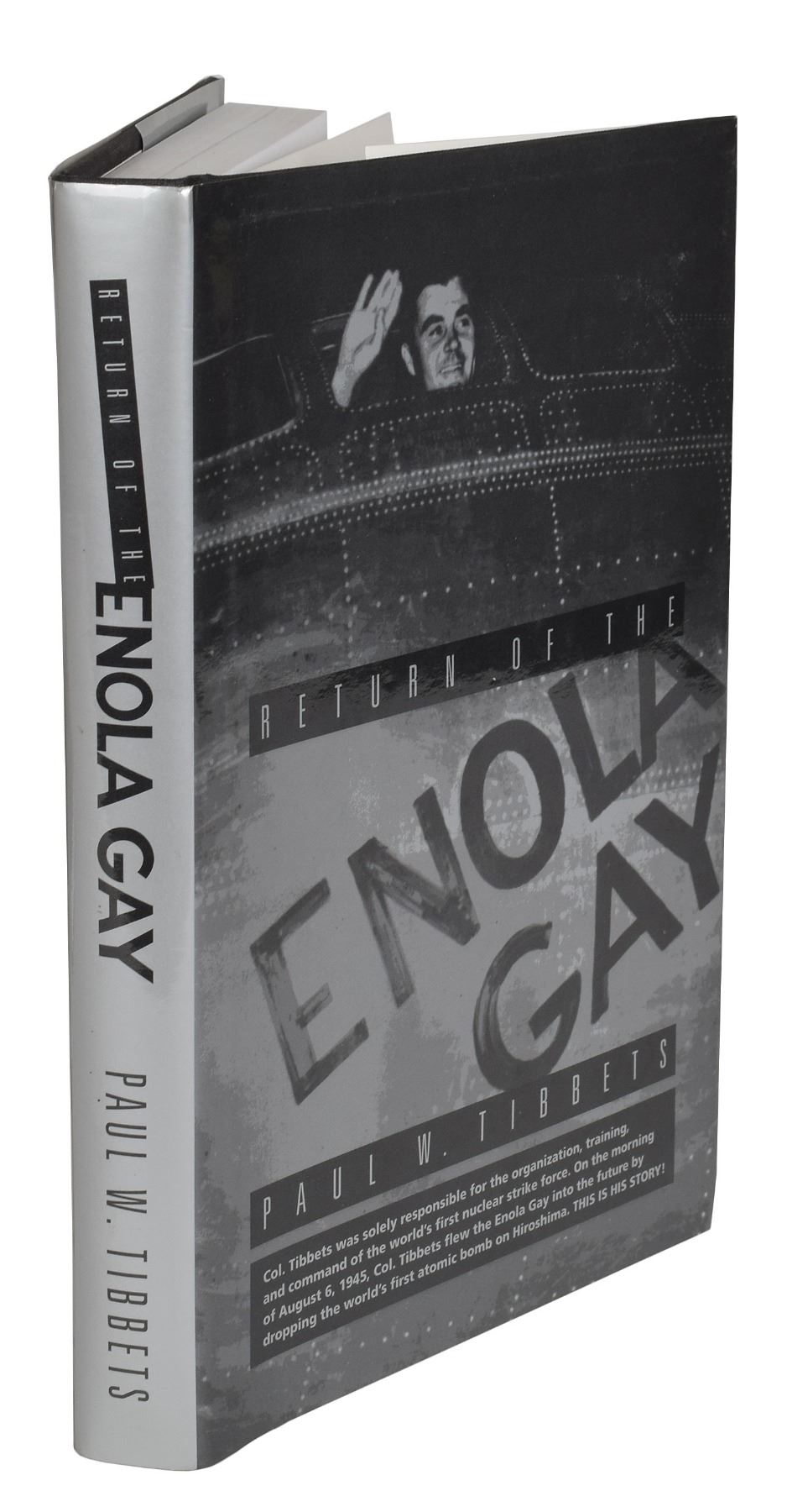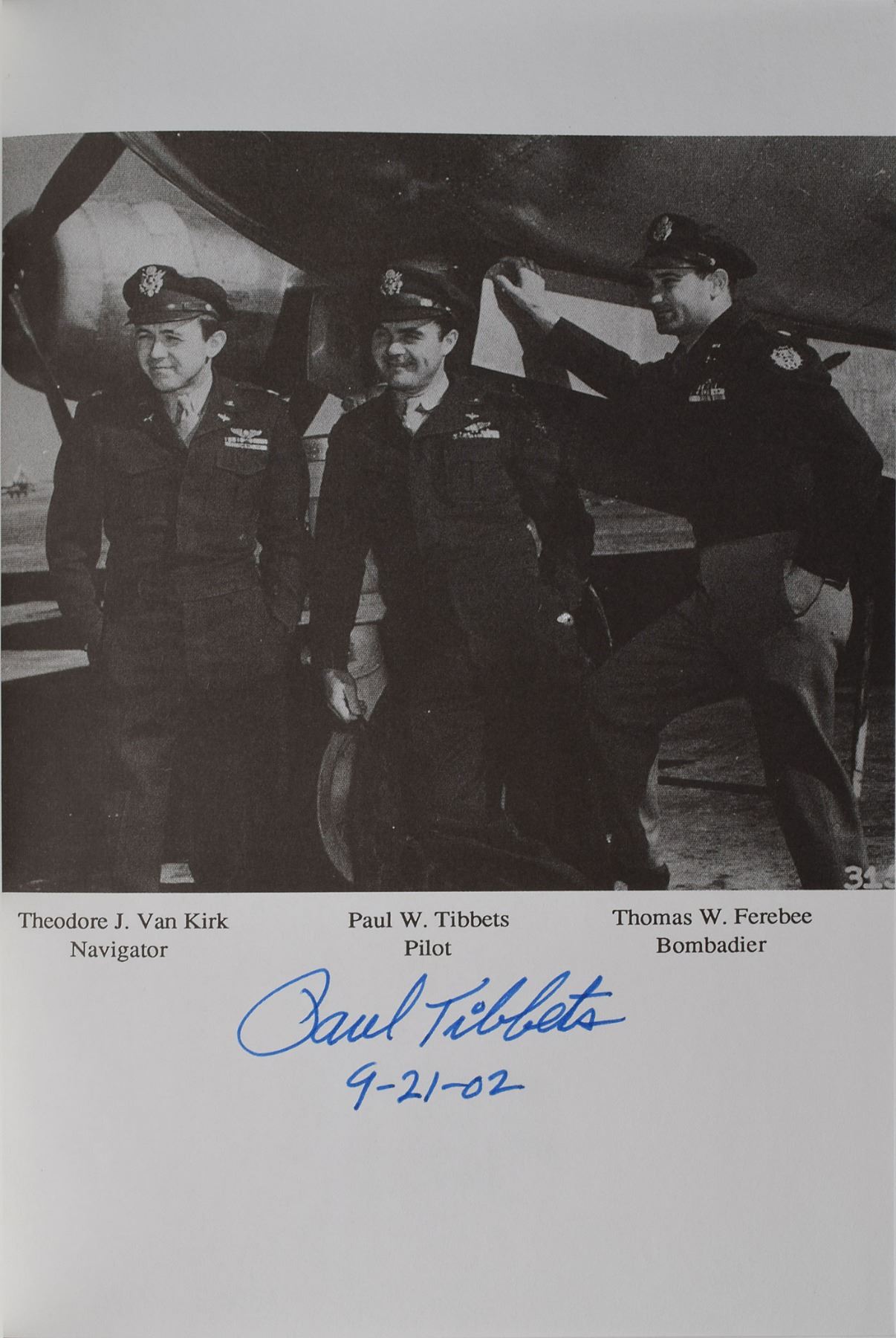 A framed original color 14 x 20 American World War II propaganda poster from 1942, depicting the hand of Uncle Sam over a man's mouth, reading, "Quiet! Loose Talk Can Cost Lives." Lower border reads, in part: "Distributed in the interest of national defense, and as a means of obtaining funds for ambulances wherever needed." Plus a collection of seven books related to WWII aviation, including: two copies of Return of the Enola Gay, both hardcover with dust jacket, each signed on the frontispiece in felt tip by the pilot, "Paul Tibbets, 9-21-02"; The Vanishing Paperclips: America's Aerospace Secret, hardcover with dust jacket, signed inside in ballpoint by the author, a German aerospace engineer who came to America in Operation Paperclip, "With best wishes, Hans H. Amtmann"; and unsigned hardcover copies of the Aeronautical Chamber of Commerce of America's annual Aircraft Year Book for the years 1940, 1941, 1942, and 1943 (two with dust jackets). In overall very good to fine condition.