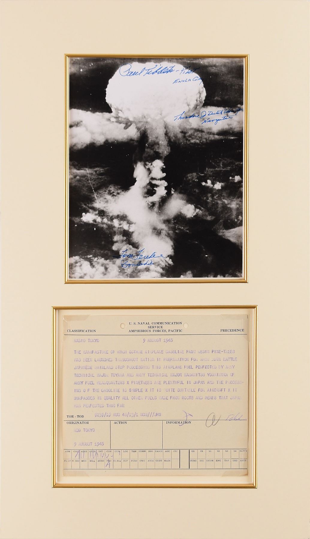 Important US naval dispatch from the day of the atomic bombing of Nagasaki, one page, 8 x 7, headed, "U.S. Naval Communication Service, Amphibious Forces, Pacific," August 9, 1945. Originating from Radio Tokyo, the dispatch reads: "The manufacture of high octane airplane gasoline from resin pine-trees has been launched throughout nation in preparation for show down battle Japanese mainland stop processing this airplane fuel perfected by army technical major Toyama and army Technical major Masamitsu Yoshimura of Army fuel headquarters x Pinetrees are plentiful in Japan and the processing of the Gasoline is simple x it is quite suitable for aircraft x it surpasses in quality all other fuels made from roots and herbs that Japan has perfected thus far." Corner-mounted and matted with a satin-finish 8 x 10 photo of the Hiroshima mushroom cloud, signed in blue felt tip by Enola Gay crewmen Paul Tibbets, Dutch Van Kirk, and Tom Ferebee to an overall size of 13.5 x 23.5. In fine condition.