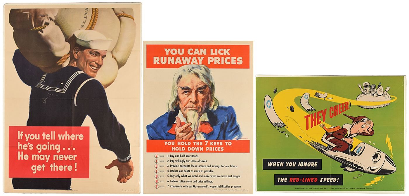 Three American propaganda posters from World War II: a color 20 x 28 poster published by the Office of War Information (1943-O-556153), featuring a sailor with a bag on his shoulder and the caption: "If you tell where he's going… He may never get there!"; a color 22 x 17 poster published by the Directorate of Air Traffic and Safety, showing caricatures of the Axis leaders watching as an American airplane breaks up, with the caption: "They cheer when you ignore the red-lined speed!"; and a color 16 x 22.75 poster published by the Office of Economic Stabilization, depicting Uncle Sam, offering seven economic tips with the caption: "You can lick runaway prices." In overall fine condition.