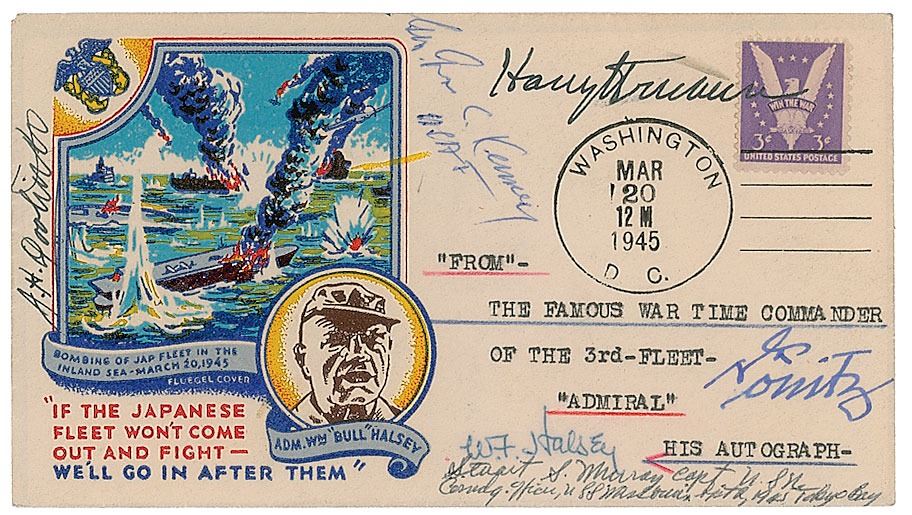 Commemorative cover with a cachet honoring the bombing of the Japanese fleet in 1945, signed in various inks by Harry S. Truman, William F. Halsey, James H. Doolittle, George C. Kenney, Stuart S. Murray, and Karl Dönitz. In fine condition. An unusual combination of signatures representing many facets of World War II.