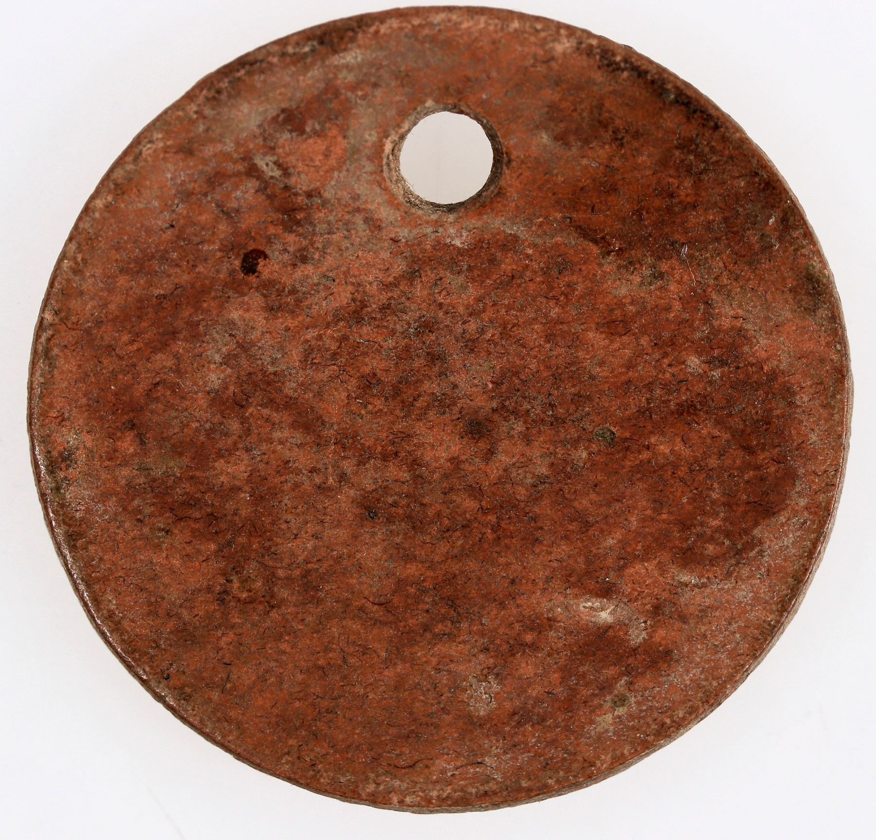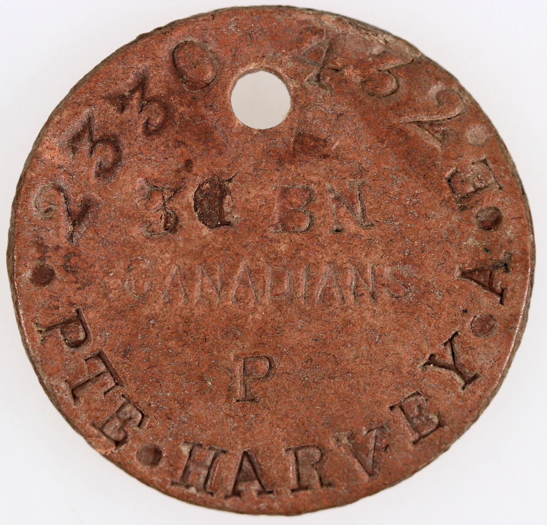 Military identification tag from the First World War, belonging to a Canadian soldier named Harvey from the 36th Battalion with the service number 2330. 35 mm, round, holed. World War One Canadian dog tags were made from aluminum, but by August 1914, were replaced with red fiber discs made of vulcanized asbestos and synthetic rubber. The discs were designed to be broken in half, with one piece remaining with the body and the other sent to command.