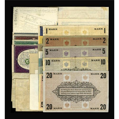 <B>World War One German POW Issues.</B></I><BR> Burg 5; 10 Mark Campbell 2785-6 <B>CU</B></I><BR>Chemnitz 1; 2; 5; 10; 20; 50 Pfennig; 1; 2; 5; 10; 20 Mark Campbell 2810-20 <B>XF </B></I>or better<BR>Dobeln 1; 5; 10 Mark Campbell 2885; 2887-8 <B>CU<BR></B></I>Eglosheim 1; 2; 5; 10; 20; 50 Pfennig; 1; 2; 5 Mark Campbell 2919-27 <BR>Eschwege 50 Pfennig; 1 Mark Campbell 2944-5 <B>CU</B></I><BR>Frankfurt am Oder 1; 5; 10; 25; 50 Pfennig; 1 Mark Campbell 2962-7 <B>CU<BR></B></I>Friedricksfeld 1; 5; 10 Pfennig; 1; 2 Mark 2986-8; 2990-1 <B>CU</B></I><BR>Gardelegen 50 Pfennig; 1 Mark Campbell 2998-9 <B>Fine<BR></B></I>Gottingen 1; 5; 10 Pfennig; 1; 2; 5 Mark 3019-21; 3023-5 <B>Fine </B></I>or better<BR>Guben 1; 5; 10; 25; 50 Pfennig Campbell 3053-7 <B>AU </B></I>or better.<BR><BR><BR><b>Shipping:</b> Coins & Currency (<a target="_blank" href="http://www.heritageauctions.com/common/shipping.php">view shipping information</a>)