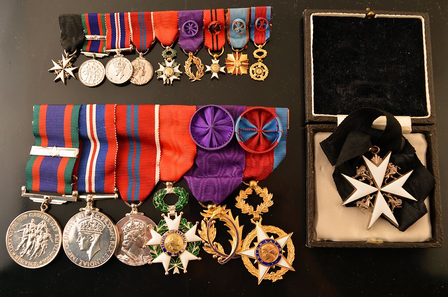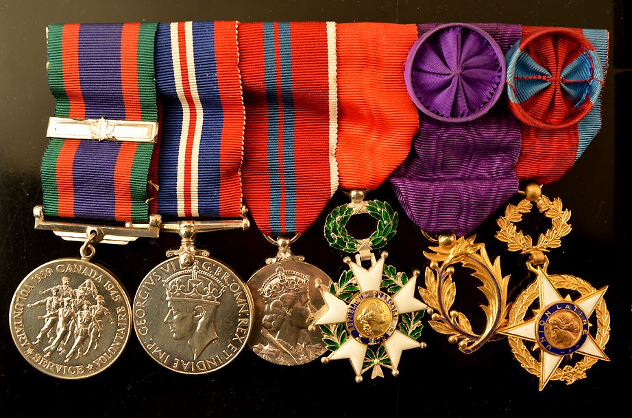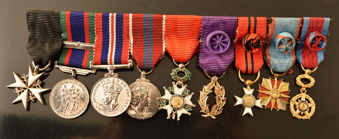 Canada, group of seven, including: Most Venerable Order of the Hospital of St. John of Jerusalem, silver star, white enamel, black ribbon, in case of issue; CVSM; War Medal, 1939-1945; QEII Coronation Medal, Military Issue; France, Croix de Guerre, enamel chipped; France, Officer of Public Education, Au, (gilt), type 3, light chipping; France, order of the Latin Union, gilt, with white and blue enamel; included are the miniature medals, although there are two extra miniatures: Haiti, croix du merite; France, undetermined, medal for peace; Total of 16 pcs.