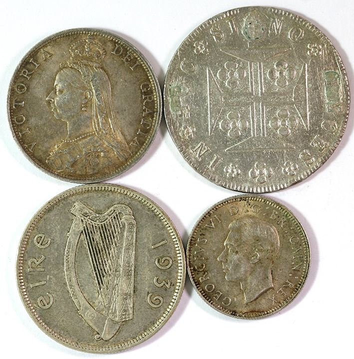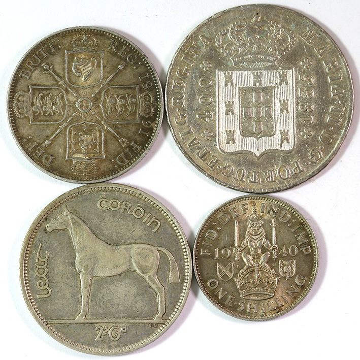Brzail 1835 400 Reis (ex mounted), Ireland 1939 Florin, Great Britain 1891 Florin, 1940 Shilling. Good to extremely fine. (4)
