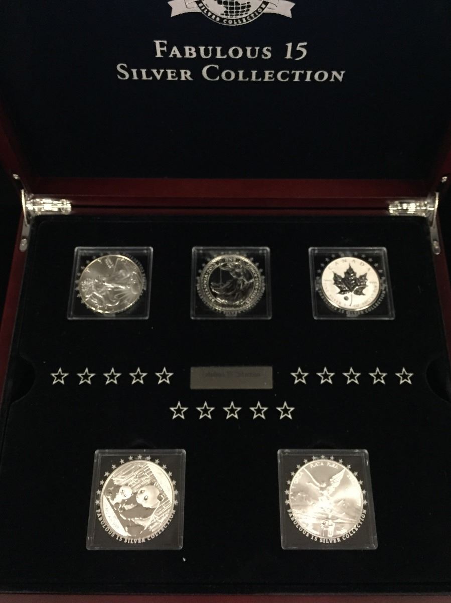 Fabulous fifteen silver collection, all coins issued in 2012, includes Andorra 20g Five Diners, Armenia 1oz Five Hundred Dram, Australia 1oz One Dollar Kangaroo at sunset, Australia 1oz One Dollar Koala, Australia 1oz One Dollar Year of Dragon, Austria 1oz One and Half Euro, Canada 1oz Five Dollars Maple Leaf, China 1oz Ten Yuan Panda, Cook Islands 1oz Ten Dollars Tiki, Fiji 1oz Two Dollars Taku, Great Britain 1oz Two Pounds Britannia, Mexico 1oz Onza, Rwanda 1oz Fifty Francs Rhino, South Africa 15g One Rand, USA 1oz One Dollar Eagle. All housed in its capsule and case, with certificates. (15)