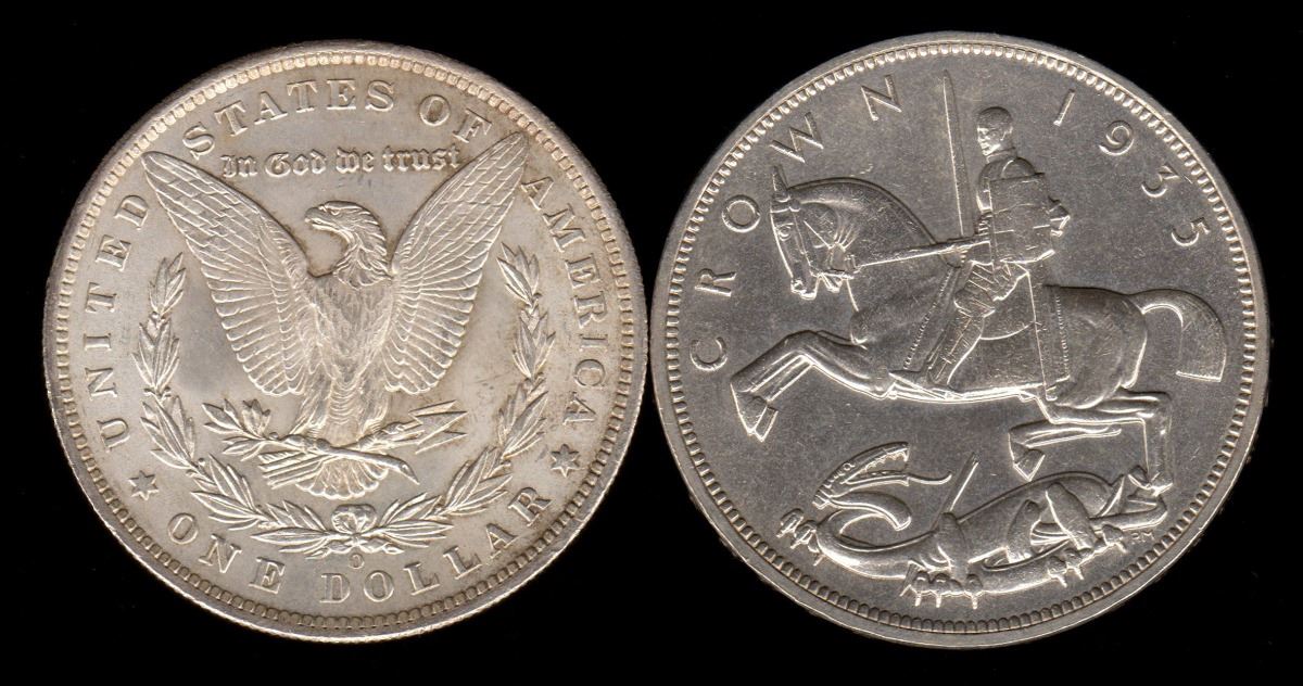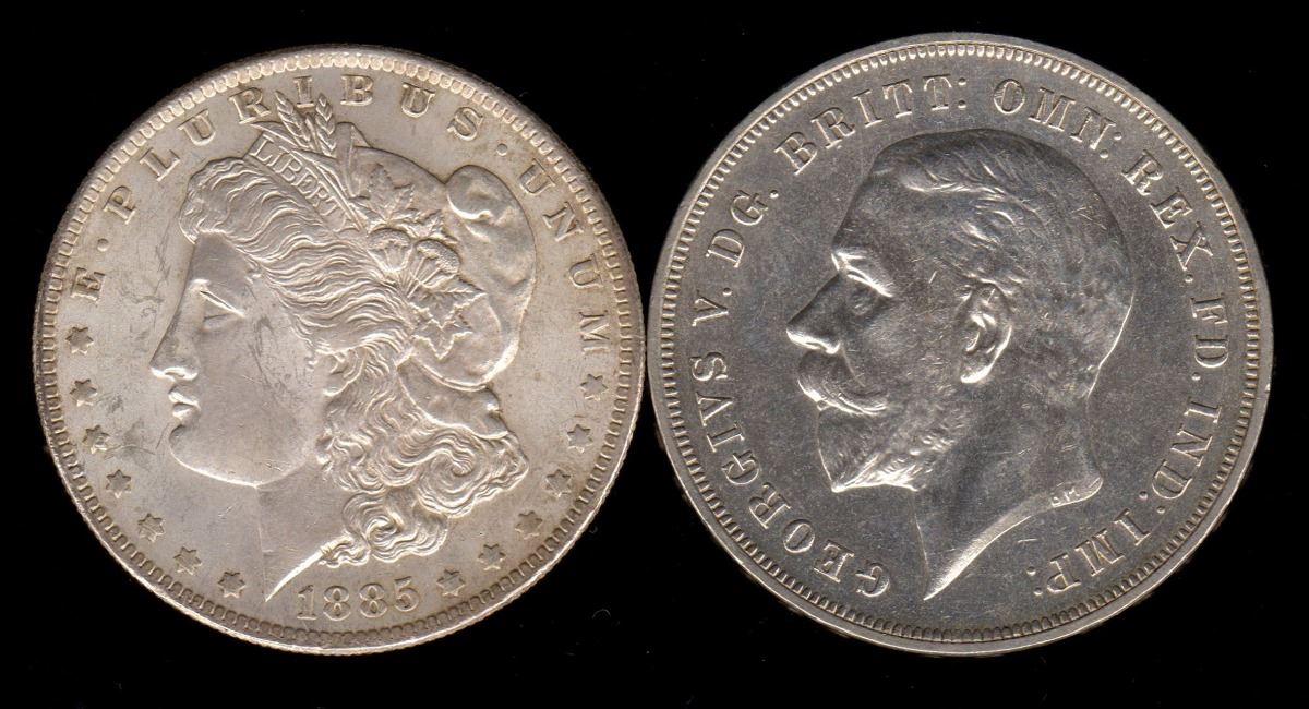 Great Britain, 1935 Crown; United States, 1885 O Dollar. Extremely fine and uncirculated. (2)