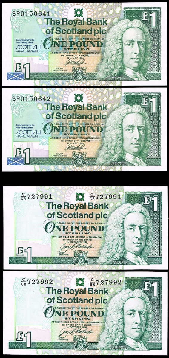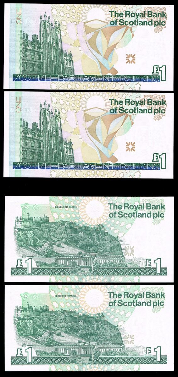 Scotland, Royal Bank of Scotland One Pound Note, 1997 (2), 1999 (2) two consec pairs, almost Uncirculated (P.351c; P.360)