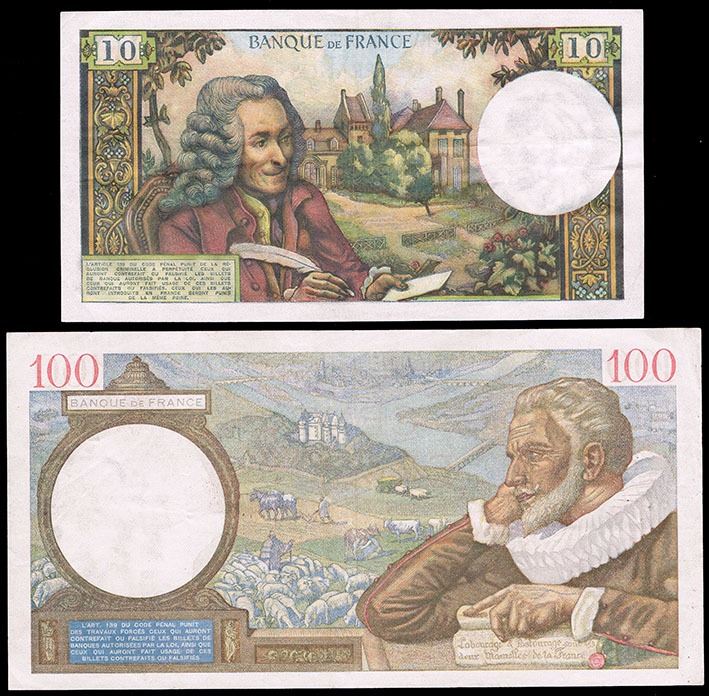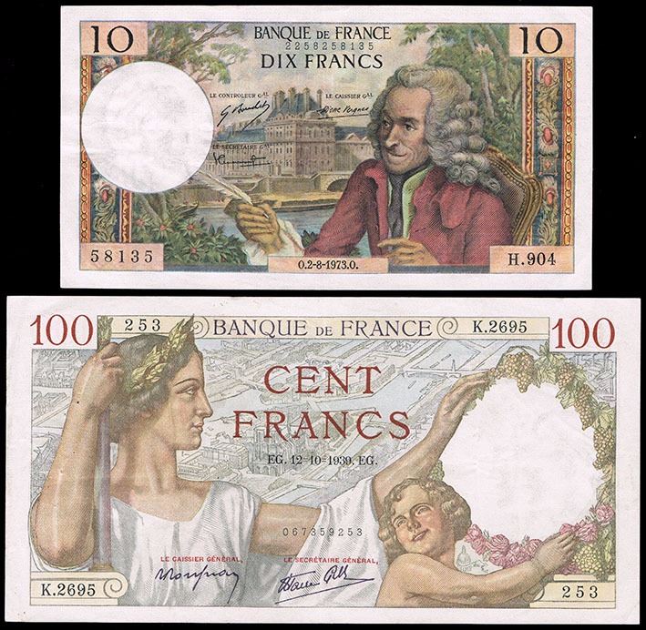France Ten Francs Note 1973; together with One Hundred Francs 1939, the first good Very Fine, the last almost Extremley Fine, with usual pin holes (P.147d; P.94)