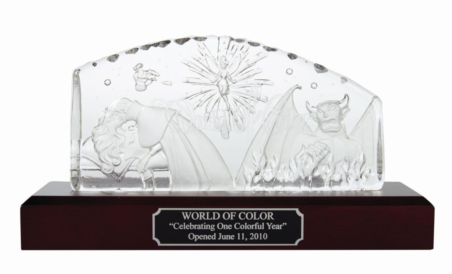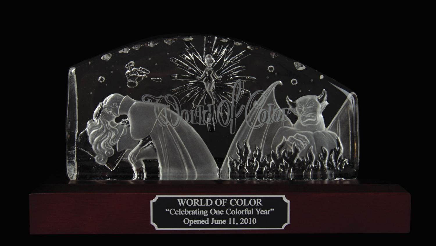 (California Adventure, 2011) An etched glass light display given exclusively to the project team that worked on the World of Color nighttime multimedia show at California Adventure. Created in collaboration with Arribas Bros, the piece consists of a stylized glass slab with faux rough gem edges, inverted relief etchings of Disney characters on the reverse, and the World of Color text logo on the face. The slab sits atop a wooden base with a recessed row of LED lights that illuminate the glass (non-functional from corrosion to the battery contacts). A metal plaque on the front of the base reads, "Celebrating One Colorful Year Opened June 11, 2010." Measuring 5"x11" and 3.5" deep assembled, the piece is in very good condition with some surface wear.