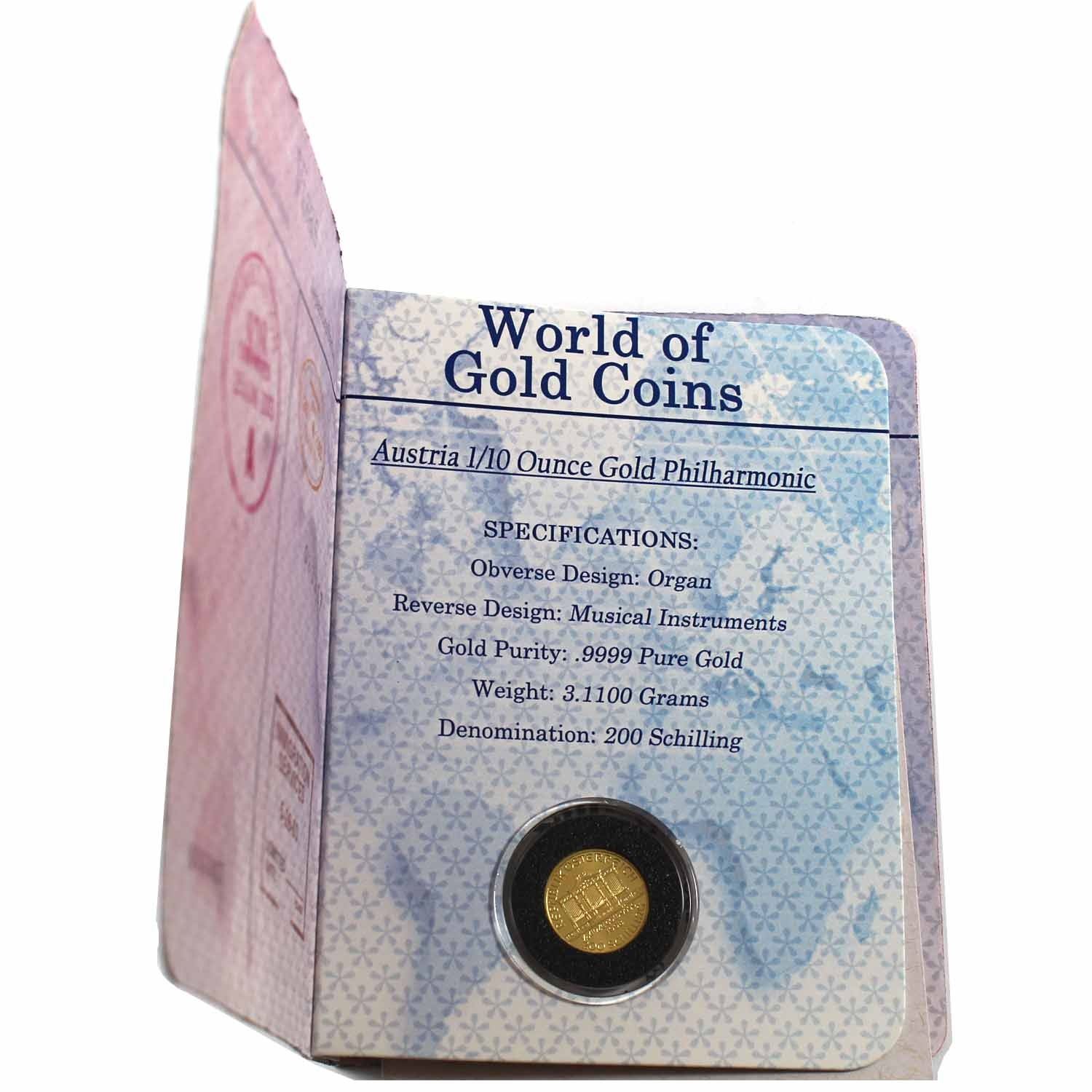 World of Gold Coins Passport 1998 Austria 1/10oz Philharmonic .9999 Fine Gold Coin Encapsulated in Folder by the First Commemorative Mint with COA (TAX Exempt)