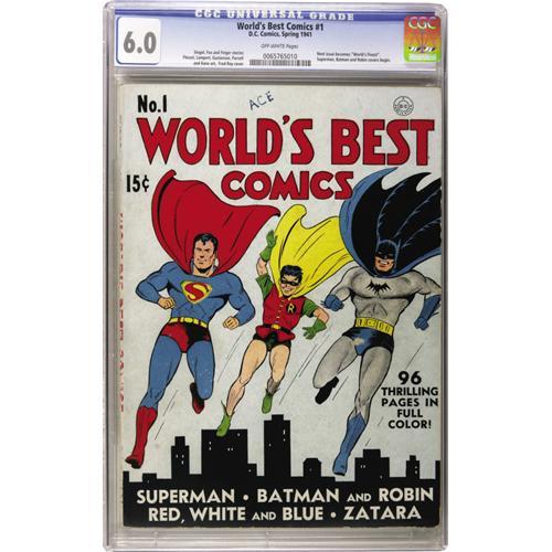 <B>World's Best Comics #1 (DC, 1941) CGC FN 6.0 Off-white pages.</B></I> DC continued the 100-page format created for the <B>New York World's Fair</B></I> souvenir comics with this title, which changed to <B>World's Finest Comics</B></I> with issue #2. Superman, Batman, and Robin begin appearing together on the covers, although the Man of Steel and the Dynamic Duo are featured separately inside. Other features include the Crimson Avenger, Zatara, and Johnny Thunder. Art is supplied by Fred Ray, Bob Kane, Harry Lampert, and Creig Flessel. This is a very nice-looking square bound copy. Overstreet 2006 FN 6.0 value = $4,287. CGC census 11/06: 1 in 6.0, 15 higher.<BR><BR><b>Shipping:</b> Slabbed Comic (<a target="_blank" href="http://www.heritageauctions.com/common/shipping.php">view shipping information</a>)