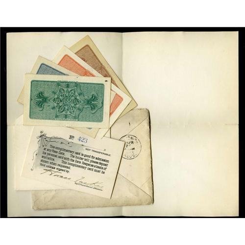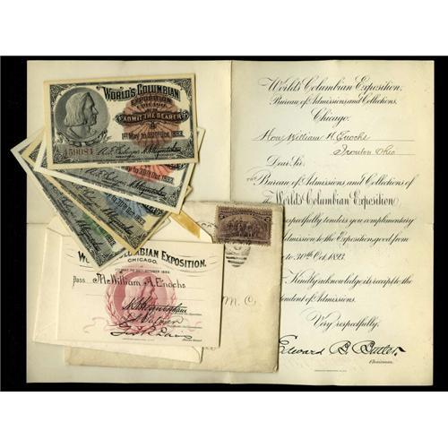 <B>World's Columbian Exposition Pass Chicago May 1 - Oct. 30, 1893.</B></I><BR>This most interesting lot has a World's Columbian Exposition complimentary pass made out to the Honorable William H. Enochs, US Representative from Ironton, Ohio. The probable reason why this pass exists today is because Mr. Enochs passed away on July 13, 1893. The ABNCo engraved pass is approximately 4 by 2.5 inches and it exhibits a portrait of Columbus that is similar to the Columbus portrait that is found on some regular admission tickets for this expo. Included with this lot is an ABNCo engraved transmittal letter addressed to Mr. Enochs, the original cover with split sides addressed to Mr. Enochs using a 2¢ Landing of Columbus stamp, complimentary pass storage envelope, plus the following ABNCo engraved regular admission tickets of Columbus, Indian with "A" overprint, Washington with "A" overprint, and Lincoln with "A" overprint. The four regular admission tickets were added later to the complimentary pass and associated items.<BR><BR><b>Shipping:</b> Coins & Currency (<a target="_blank" href="http://www.heritageauctions.com/common/shipping.php">view shipping information</a>)