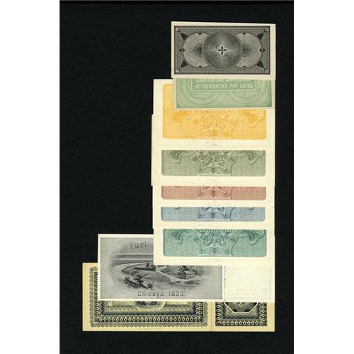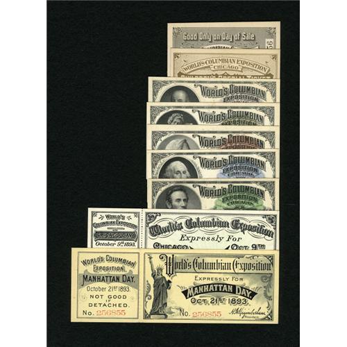<B>World's Columbian Exposition Ticket Chicago 1893 Grouping.</B></I><BR> The following <B>Choice Crisp Uncirculated </B></I>tickets are included - Columbus; Washington; Lincoln; Franklin; and the key Handel ticket. There are also a Chicago Day ticket and a Manhattan Day ticket. Both of these have retained their stub. A "1/N" Good Only on Day of Sale ticket is included, too. The code 1/N tells us this ticket was for a day in May 1893. The final ticket in this lot is for a "V" Children's Special Ticket. Children's tickets were good for the ages of 7 to 17. The "V" also tells us this ticket sold for the reduced children's rate of 10¢ that was in effect from October 10, 1893 to October 21, 1893, the last days of the exposition.<BR> <BR><BR><b>Shipping:</b> Coins & Currency (<a target="_blank" href="http://www.heritageauctions.com/common/shipping.php">view shipping information</a>)
