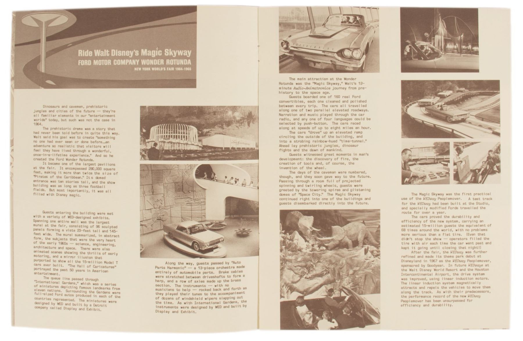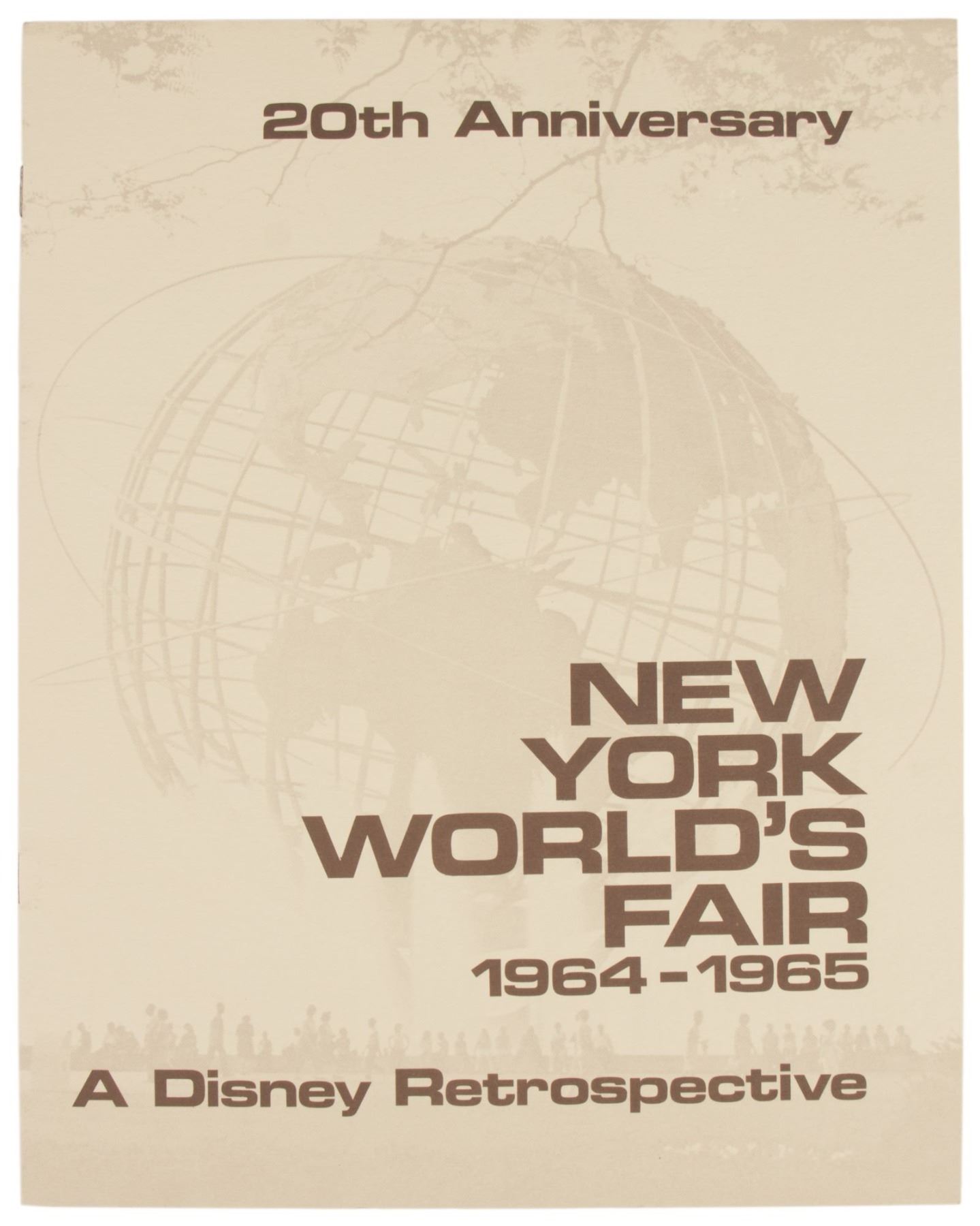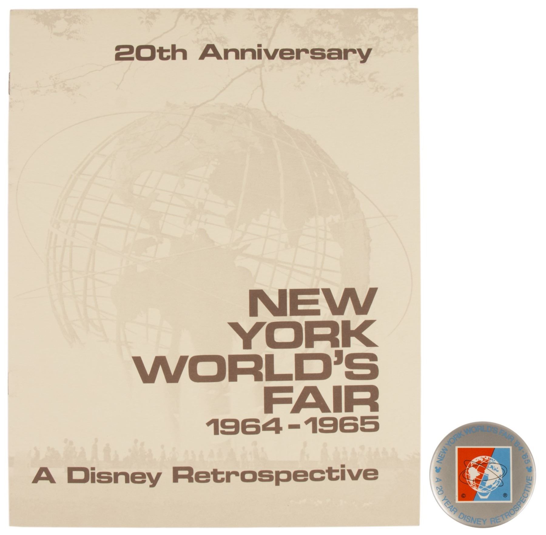 (World's Fair, 1984) A booklet and pin created by WED Enterprises for the 20th anniversary celebration of the 1964-65 New York World's Fair. The booklet contains 6-pages of facts and information on how and why Walt Disney became involved with the World's Fair. The pin features the World's Fair logo in blue and red and measures 2.5" in diameter. The booklet measures 11"x8.5" and the condition is very good overall with minor wear from use.