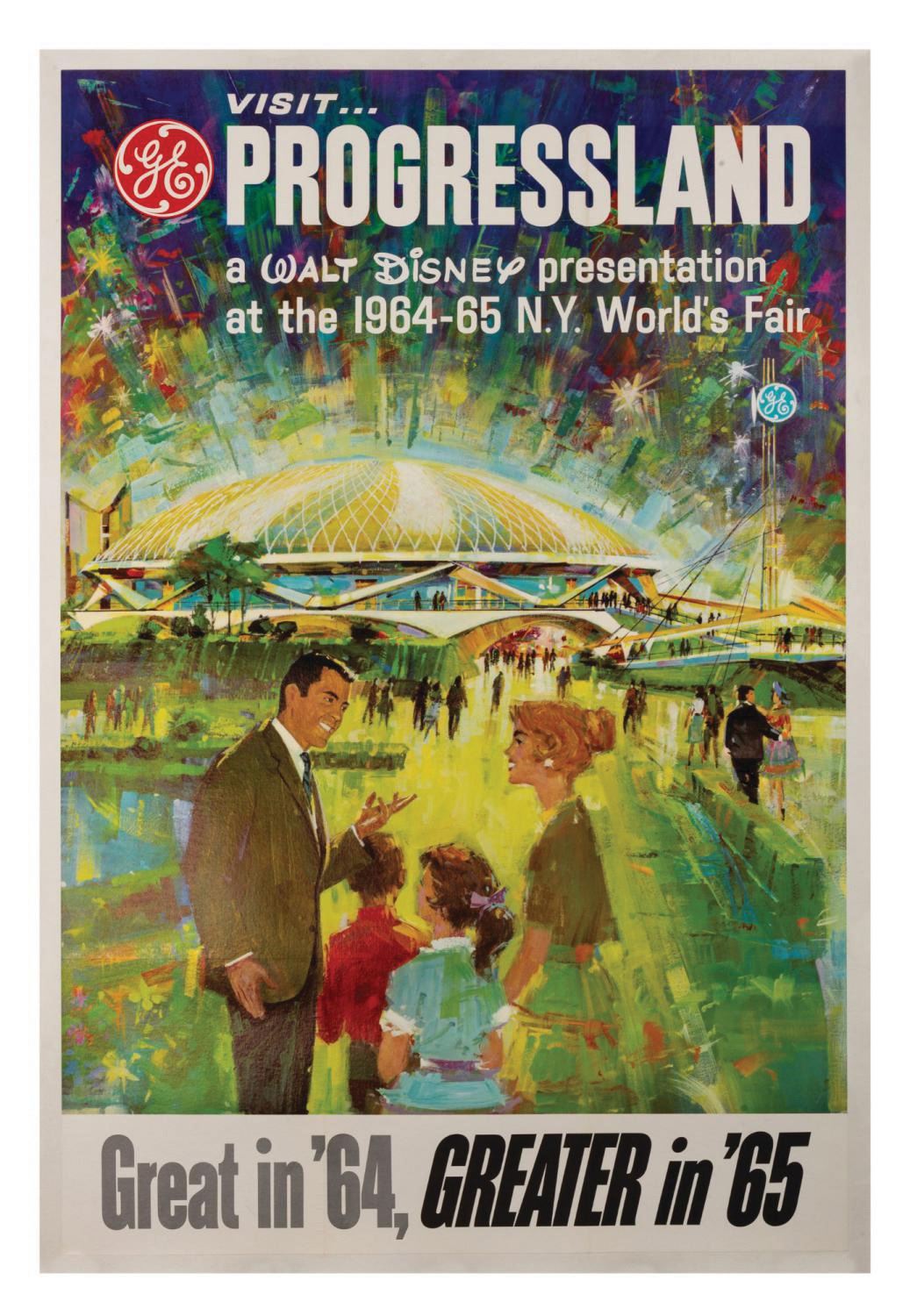 (World's Fair, 1965) A bold and colorful lithographic print advertising the second season of Walt Disney and General Electric's Progressland presentation at the New York World's Fair. The poster captures the dramatic Skydome nighttime spectacular, while featuring the popular second season slogan of the New York World's Fair, "Great in '64, Greater in '65". Measuring 42.5"x28.25" the linen-backed poster presents in fine condition.