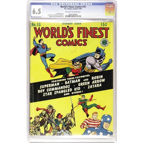 <B>World's Finest Comics #10 (DC, 1943) CGC FN+ 6.5 Off-white to white pages.</B></I> Joe Simon and Jack Kirby's Boy Commandos are featured in this 76-page issue, alongside such favorites as Superman, Batman, Green Arrow, and Star Spangled Kid. Other artists include Hal Sherman, Bob Kane, and Jerry Robinson. Overstreet 2006 FN 6.0 value = $510; VF 8.0 value = $1,063. CGC census 5/06: 4 in 6.5, 8 higher. <BR><BR><B>Important notice:</B> Heritage usually auctions material at the rate of 200-250 lots per hour. On some occasions eBay Live bid software or the Internet may not be able to keep up with the pace of the auction. We recommend placing a realistic absentee bid now as insurance to avoid disappointment. Occasionally the auctioneer may eliminate or reject an eBay Live bid, and the auctioneer may also reopen a lot after the close of the eBay live bidding (usually because we missed an audience bid), and may reject your bid even if it shows you as the winning bidder. By bidding via eBay Live, you agree that Heritage may award the lot to another bidder at its sole discretion under the circumstances described above or any other reasonable circumstances. Since eBay bids are not shown to us until we open the lot on the floor, we treat those bids just like floor bids. In most cases the floor responds before the eBay bid is presented to us, due to Internet lag time, so for consistency we have made it a policy that floor bids are always considered first over tie eBay live bids. Also please note that all Heritage lots purchased through eBay Live carry a 22.5% Buyer's Premium. Please make sure you read the Terms and Conditions before you bid. This lot is being auctioned in conjunction with a live floor auction by Heritage Auction Galleries. All final auction and invoice information will be supplied by Heritage Auction Galleries, and all other information should be considered preliminary. Lot:41001 <BR><BR><B>Winning Notification and Billing:</B> After the FINAL session in this auction is complete, Heritage will send e-mail and snail mail invoices. This process normally takes several days. All final auction and invoice information will be supplied by Heritage Auction Galleries, and all other information should be considered preliminary. <BR><BR>This auction will be conducted on a live auction floor and over the Internet through eBay Live. If you choose to place an absentee bid, please take a moment to <font color='#0000ff'><u><a href='http://pages.ebay.com/liveauctions/help/before/laabsentee.html'>learn how eBay Live absentee bidding works</a></u></font><font color='#000000'>