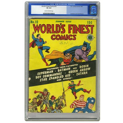 <B>World's Finest Comics #10 (DC, 1943) CGC VG 4.0 Cream to off-white pages.</B></I> Bob Kane, Jerry Robinson, and Simon and Kirby art. Square bound giant issue. Overstreet 2006 VG 4.0 value = $340. CGC census 3/06: 1 in 4.0, 15 higher.