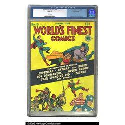 World's Finest Comics #10 San Francisco pedigree (DC, 1943) CGC VF+ 8.5 White pages. The San Francisco collection is known for the exceptionally white pages and bright, clean look. This book matches all of those criteria perfectly, and only has some minor wear around the four edges to slightly downgrade it. The medium blue spine on this gigantic book is flat and smooth, with nary a defect. Overstreet 2002 VF 8.0 value = $994. Important notice: We expect to be auctioning lots at the rate of 200-250 per hour. Sometimes eBay Premier live bid software cannot keep up with that pace, so we strongly recommend that you place a realistic proxy bid now as insurance to avoid disappointment. Also please note that all Heritage/CAA lots purchased through eBay Premier carry a 20% Buyer's Premium. Please make sure you read the Terms and Conditions.