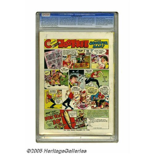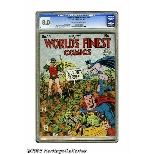 <B>World's Finest Comics #11 (DC, 1943) CGC VF 8.0 Cream to off-white pages.</B></I> The concept of a ""Victory Garden"" was that citizens on the home front would do their civic duty by growing as much of their own produce as possible, thereby freeing up food supplies to be shipped to the fighting men overseas. And DC's heroes showed how it was done here, as illustrated by Jack Burnley and Jerry Robinson. Batman and Superman were just two of the many characters appearing in the issue. Only two copies (the best being VF/NM) are above ours in CGC's census as of this writing. Overstreet 2005 VF 8.0 value = $863. CGC census 9/05: 1 in 8.0, 2 higher. <BR><BR><B>Important notice:</B> Heritage usually auctions material at the rate of 200-250 lots per hour. On some occasions eBay Live bid software or the Internet may not be able to keep up with the pace of the auction. We recommend placing a realistic absentee bid now as insurance to avoid disappointment. Occasionally the auctioneer may eliminate or reject an eBay Live bid, and the auctioneer may also reopen a lot after the close of the eBay live bidding (usually because we missed an audience bid), and may reject your bid even if it shows you as the winning bidder. By bidding via eBay Live, you agree that Heritage may award the lot to another bidder at its sole discretion under the circumstances described above or any other reasonable circumstances. Since eBay bids are not shown to us until we open the lot on the floor, we treat those bids just like floor bids. In most cases the floor responds before the eBay bid is presented to us, due to Internet lag time, so for consistency we have made it a policy that floor bids are always considered first over tie eBay live bids. Also please note that all Heritage lots purchased through eBay Live carry a 20% Buyer's Premium. Please make sure you read the Terms and Conditions before you bid. This lot is being auctioned in conjunction with a live floor auction by Heritage Galleries & Au