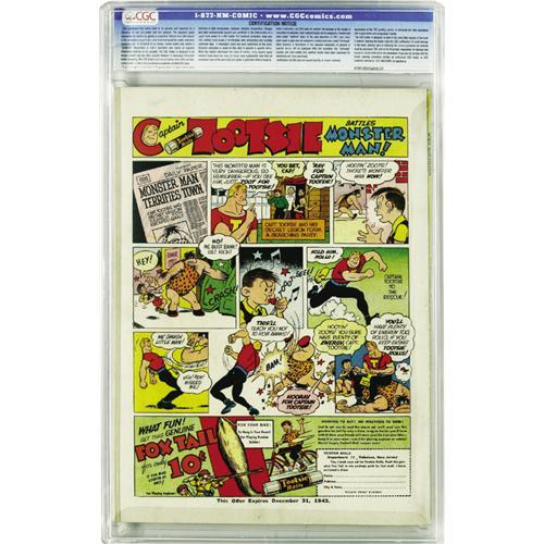 <B>World's Finest Comics #11 (DC, 1943) CGC VF+ 8.5 Cream to off-white pages.</B></I> The <B>World's Finest</B></I> team of Superman, Batman, and Robin bring in a bumper crop in this World War II "victory garden" cover illustration, by Jack Burnley. Those pint-sized defenders of freedom, the Boy Commandos, are featured inside, with art by Joe Simon and Jack Kirby. Other features include a Batman story by Jerry Robinson, and appearances by Green Arrow and Zatara. This square bound issue sports a straight spine and an unblemished cardboard cover. Overstreet 2006 VF 8.0 value = $869; VF/NM 9.0 value = $1,372. CGC census 5/06: 4 in 8.5, 1 higher. <BR><BR><B>Important notice:</B> Heritage usually auctions material at the rate of 200-250 lots per hour. On some occasions eBay Live bid software or the Internet may not be able to keep up with the pace of the auction. We recommend placing a realistic absentee bid now as insurance to avoid disappointment. Occasionally the auctioneer may eliminate or reject an eBay Live bid, and the auctioneer may also reopen a lot after the close of the eBay live bidding (usually because we missed an audience bid), and may reject your bid even if it shows you as the winning bidder. By bidding via eBay Live, you agree that Heritage may award the lot to another bidder at its sole discretion under the circumstances described above or any other reasonable circumstances. Since eBay bids are not shown to us until we open the lot on the floor, we treat those bids just like floor bids. In most cases the floor responds before the eBay bid is presented to us, due to Internet lag time, so for consistency we have made it a policy that floor bids are always considered first over tie eBay live bids. Also please note that all Heritage lots purchased through eBay Live carry a 22.5% Buyer's Premium. Please make sure you read the Terms and Conditions before you bid. This lot is being auctioned in conjunction with a live floor auction by Heritage Auction Galleries. All final auction and invoice information will be supplied by Heritage Auction Galleries, and all other information should be considered preliminary. Lot:41001 <BR><BR><B>Winning Notification and Billing:</B> After the FINAL session in this auction is complete, Heritage will send e-mail and snail mail invoices. This process normally takes several days. All final auction and invoice information will be supplied by Heritage Auction Galleries, and all other information should be considered preliminary. <BR><BR>This auction will be conducted on a live auction floor and over the Internet through eBay Live. If you choose to place an absentee bid, please take a moment to <font color='#0000ff'><u><a href='http://pages.ebay.com/liveauctions/help/before/laabsentee.html'>learn how eBay Live absentee bidding works</a></u></font><font color='#000000'>
