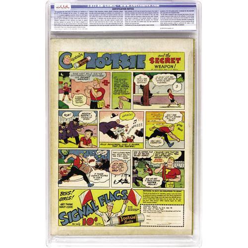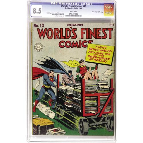 <B>World's Finest Comics #13 Davis Crippen ("D" Copy) pedigree (DC, 1944) CGC VF+ 8.5 White pages.</B></I> Jack Burnley's patriotic cover makes this one worth a look, especially for its description of Hitler as "the paper-hanger of Berlin!" So in addition to ruining the world, the Fuehrer also wrote bad checks... typical! In addition to Superman and Batman stories, there's a Boy Commandos story that most sources credit to Jack Kirby and/or Joe Simon. Overstreet 2006 VF 8.0 value = $869; VF/NM 9.0 value = $1,372. CGC census 10/06: 1 in 8.5, 4 higher. <I>From the Crippen Collection.</B></I><BR><BR><b>Shipping:</b> Slabbed Comic (<a target="_blank" href="http://www.heritageauctions.com/common/shipping.php">view shipping information</a>)