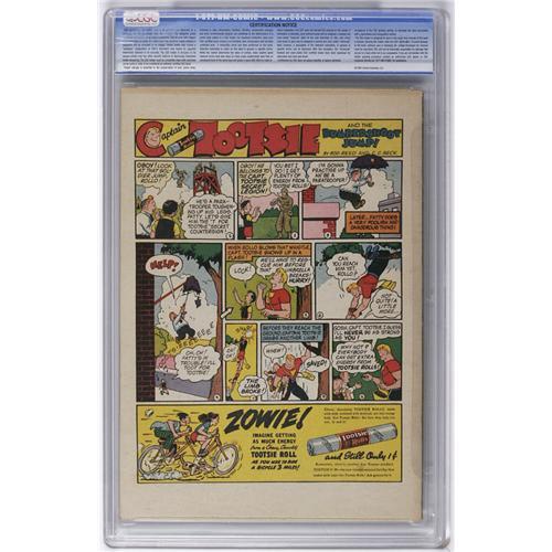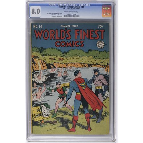 <B>World's Finest Comics #14 (DC, 1944) CGC VF 8.0 Off-white to white pages.</B></I> Here's one of the best copies we've seen of this issue, and as yet CGC has only certified one with a higher grade! Jack Burnley was the perfect artist to portray the good clean fun of going to the old swimmin' hole, and there's more fun inside with Batman, Superman, Green Arrow, the Star-Spangled Kid and others. Note that a small plastic stabilizing peg is loose inside the CGC holder, not affecting the comic itself or the integrity of the holder. Overstreet 2006 VF 8.0 value = $869. CGC census 3/06: 2 in 8.0, 1 higher. <I>From the Collection of Harold Curtis.</B></I>
