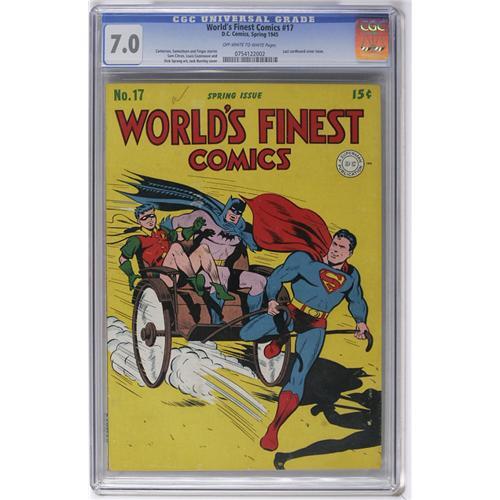 <B>World's Finest Comics #17 (DC, 1945) CGC FN/VF 7.0 Off-white to white pages.</B></I> A Dick Sprang Batman story is just one of the highlights of this hero-packed issue. This was the last book in the series to have a cardboard cover. Overstreet 2006 FN 6.0 value = $417; VF 8.0 value = $869. CGC census 3/06: 5 in 7.0, 9 higher. <I>From the Collection of Harold Curtis.</B></I>