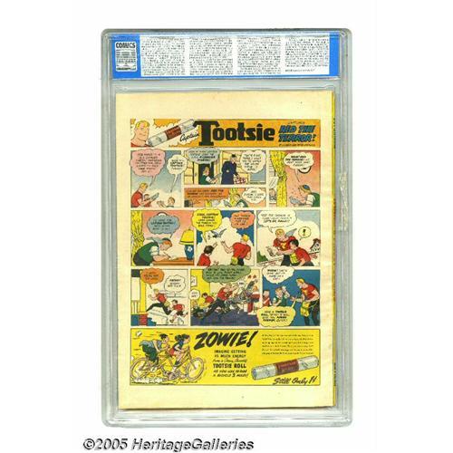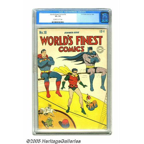 <B>World's Finest Comics #18 (DC, 1945) CGC VF+ 8.5 Off-white to white pages.</B></I> A square bound book with a white cover isn't easy to find ""in grade!"" Jack Burnley drew this issue's death-defying cover scene (well, it's death-defying for Robin and Batman anyway, since they can't fly!). Batman and Superman appear in separate features inside the issue, and they're backed up by tales of Zatara, Green Arrow, the Boy Commandos, and making their last appearance in this title, the Star Spangled Kid and Stripesy. Overstreet 2005 VF 8.0 value = $756; VF/NM 9.0 value = $1,166. CGC census 9/05: 1 in 8.5, 2 higher. <BR><BR><B>Important notice:</B> Heritage usually auctions material at the rate of 200-250 lots per hour. On some occasions eBay Live bid software or the Internet may not be able to keep up with the pace of the auction. We recommend placing a realistic absentee bid now as insurance to avoid disappointment. Occasionally the auctioneer may eliminate or reject an eBay Live bid, and the auctioneer may also reopen a lot after the close of the eBay live bidding (usually because we missed an audience bid), and may reject your bid even if it shows you as the winning bidder. By bidding via eBay Live, you agree that Heritage may award the lot to another bidder at its sole discretion under the circumstances described above or any other reasonable circumstances. Since eBay bids are not shown to us until we open the lot on the floor, we treat those bids just like floor bids. In most cases the floor responds before the eBay bid is presented to us, due to Internet lag time, so for consistency we have made it a policy that floor bids are always considered first over tie eBay live bids. Also please note that all Heritage lots purchased through eBay Live carry a 20% Buyer's Premium. Please make sure you read the Terms and Conditions before you bid. This lot is being auctioned in conjunction with a live floor auction by Heritage Galleries & Auctioneers. All final auction and inv