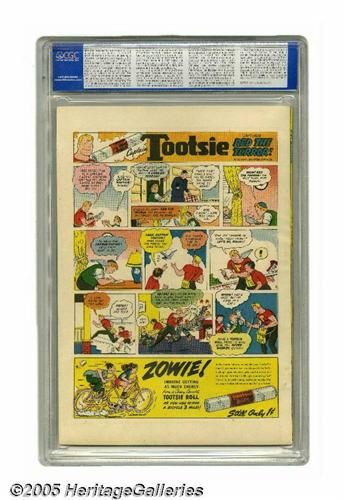 <B>World's Finest Comics #18 Mile High pedigree (DC, 1945) CGC NM+ 9.6 White pages.</B></I> A square bound book with a white cover in this grade is simply amazing! In fact, any early issue of this title in this condition is quite a find indeed. Jack Burnley drew this issue's death-defying cover scene (well, it's death-defying for Robin and Batman anyway, since they can't fly!). Batman and Superman appear in separate features inside the issue, and they're backed up by tales of Zatara, Green Arrow, the Boy Commandos, and making their last appearance in this title, the Star Spangled Kid and Stripesy. Overstreet 2005 NM- 9.2 value = $1,575. CGC census 7/05: 1 in 9.6, none higher.