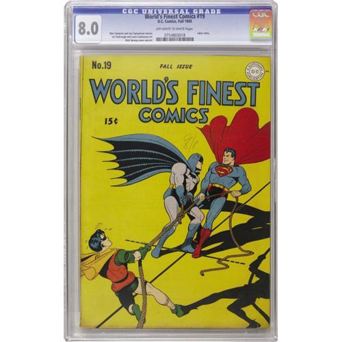 <B>World's Finest Comics #19 (DC, 1945) CGC VF 8.0 Off-white pages.</B></I> Dick Sprang drew this issue's cover as well as a Batman story featuring the villainous Joker. Also appearing are Superman, Zatara, Green Arrow, and the Boy Commandos. Overstreet 2006 VF 8.0 value = $775. CGC census 10/06: 3 in 8.0, 4 higher.<BR><BR><b>Shipping:</b> Slabbed Comic (<a target="_blank" href="http://www.heritageauctions.com/common/shipping.php">view shipping information</a>)