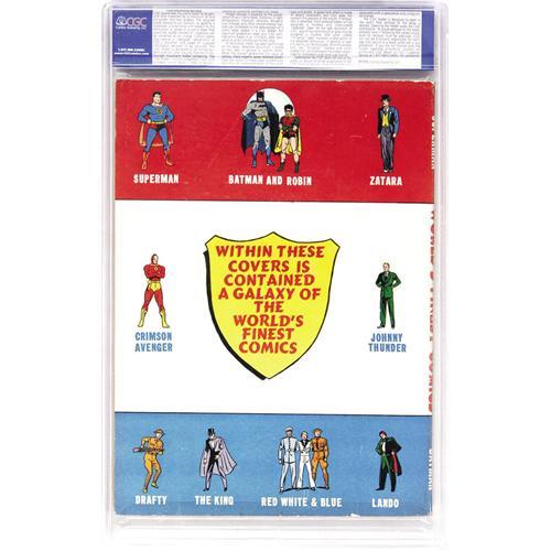 <B>World's Finest Comics #2 (DC, 1941) CGC FN+ 6.5 Light tan to off-white pages.</B></I> A name change from <B>World's Best Comics</B></I> gets this long-running title up and running. Co-stars Superman and Batman are joined by Johnny Thunder, the Crimson Avenger, and Zatara, among others. Artists include Fred Ray (cover) and Jerry Robinson. Overstreet 2006 FN 6.0 value = $1,296; VF 8.0 value = $3,024. CGC census 6/06: 1 in 6.5, 3 higher. <BR><BR><B>Important notice:</B> Heritage usually auctions material at the rate of 200-250 lots per hour. On some occasions eBay Live bid software or the Internet may not be able to keep up with the pace of the auction. We recommend placing a realistic absentee bid now as insurance to avoid disappointment. Occasionally the auctioneer may eliminate or reject an eBay Live bid, and the auctioneer may also reopen a lot after the close of the eBay live bidding (usually because we missed an audience bid), and may reject your bid even if it shows you as the winning bidder. By bidding via eBay Live, you agree that Heritage may award the lot to another bidder at its sole discretion under the circumstances described above or any other reasonable circumstances. Since eBay bids are not shown to us until we open the lot on the floor, we treat those bids just like floor bids. In most cases the floor responds before the eBay bid is presented to us, due to Internet lag time, so for consistency we have made it a policy that floor bids are always considered first over tie eBay live bids. Also please note that all Heritage lots purchased through eBay Live carry a 22.5% Buyer's Premium. Please make sure you read the Terms and Conditions before you bid. This lot is being auctioned in conjunction with a live floor auction by Heritage Auction Galleries. All final auction and invoice information will be supplied by Heritage Auction Galleries, and all other information should be considered preliminary. Lot:41001 <BR><BR><B>Winning Notification and Billing:</B> After the FINAL session in this auction is complete, Heritage will send e-mail and snail mail invoices. This process normally takes several days. All final auction and invoice information will be supplied by Heritage Auction Galleries, and all other information should be considered preliminary. <BR><BR>This auction will be conducted on a live auction floor and over the Internet through eBay Live. If you choose to place an absentee bid, please take a moment to <font color='#0000ff'><u><a href='http://pages.ebay.com/liveauctions/help/before/laabsentee.html'>learn how eBay Live absentee bidding works</a></u></font><font color='#000000'>