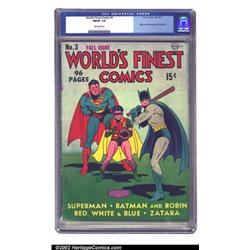 World's Finest Comics #3 (DC, 1941) CGC FN/VF 7.0 Off-white pages. This mammoth Golden Age DC has an amazingly fun cover by Jerry Robinson! It has the origin and first appearance of Scarecrow, and plenty of other exciting features. But the charming, classic cover alone was worth the price of admission. (Only 15 cents--what a deal!) Overstreet 2002 FN 6.0 value = $951; VF 8.0 value = $1,979. Important notice: We expect to be auctioning lots at the rate of 200-250 per hour. Sometimes eBay Premier live bid software cannot keep up with that pace, so we strongly recommend that you place a realistic proxy bid now as insurance to avoid disappointment. Also please note that all Heritage/CAA lots purchased through eBay Premier carry a 20% Buyer's Premium. Please make sure you read the Terms and Conditions.