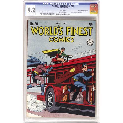 <B>World's Finest Comics #30 Davis Crippen ("D" Copy) pedigree (DC, 1947) CGC NM- 9.2 White pages.</B></I> The Davis Crippen comics were stored away without being read for the most part, hence the outstanding condition of this specimen. The cover is credited to Jack Burnley. Featured in the issue are Superman, Batman, Green Arrow, and even ex-<B>Comic Cavalcade</B></I> guy Johnny Everyman. Overstreet 2006 NM- 9.2 value = $1,175. CGC census 7/06: 2 in 9.2, none higher. <I>From the Crippen Collection.</B></I> <BR><BR><B>Important notice:</B> Heritage usually auctions material at the rate of 200-250 lots per hour. On some occasions eBay Live bid software or the Internet may not be able to keep up with the pace of the auction. We recommend placing a realistic absentee bid now as insurance to avoid disappointment. Occasionally the auctioneer may eliminate or reject an eBay Live bid, and the auctioneer may also reopen a lot after the close of the eBay live bidding (usually because we missed an audience bid), and may reject your bid even if it shows you as the winning bidder. By bidding via eBay Live, you agree that Heritage may award the lot to another bidder at its sole discretion under the circumstances described above or any other reasonable circumstances. Since eBay bids are not shown to us until we open the lot on the floor, we treat those bids just like floor bids. In most cases the floor responds before the eBay bid is presented to us, due to Internet lag time, so for consistency we have made it a policy that floor bids are always considered first over tie eBay live bids. Also please note that all Heritage lots purchased through eBay Live carry a 22.5% Buyer's Premium. Please make sure you read the Terms and Conditions before you bid. This lot is being auctioned in conjunction with a live floor auction by Heritage Auction Galleries. All final auction and invoice information will be supplied by Heritage Auction Galleries, and all other information should be considered preliminary. Lot:41001 <BR><BR><B>Winning Notification and Billing:</B> After the FINAL session in this auction is complete, Heritage will send e-mail and snail mail invoices. This process normally takes several days. All final auction and invoice information will be supplied by Heritage Auction Galleries, and all other information should be considered preliminary. <BR><BR>This auction will be conducted on a live auction floor and over the Internet through eBay Live. If you choose to place an absentee bid, please take a moment to <font color='#0000ff'><u><a href='http://pages.ebay.com/liveauctions/help/before/laabsentee.html'>learn how eBay Live absentee bidding works</a></u></font><font color='#000000'>