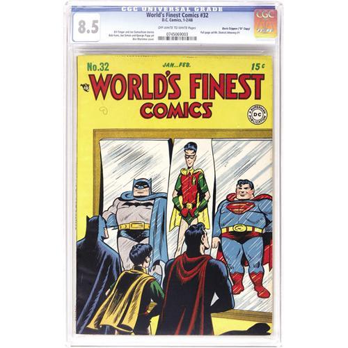 <B>World's Finest Comics #32 Davis Crippen ("D" Copy) pedigree (DC, 1948) CGC VF+ 8.5 Off-white to white pages.</B></I> Seeing as how this is a square bound book, the grade is excellent, and this is an issue that doesn't seem to pop up very often in any grade. Win Mortimer is responsible for the grins on the cover. Green Arrow, the Boy Commandos, and Zatara are the backup features. Overstreet 2006 VF 8.0 value = $488; VF/NM 9.0 value = $769. CGC census 6/06: 1 in 8.5, 1 higher. <I>From the Crippen Collection.</B></I> <BR><BR><B>Important notice:</B> Heritage usually auctions material at the rate of 200-250 lots per hour. On some occasions eBay Live bid software or the Internet may not be able to keep up with the pace of the auction. We recommend placing a realistic absentee bid now as insurance to avoid disappointment. Occasionally the auctioneer may eliminate or reject an eBay Live bid, and the auctioneer may also reopen a lot after the close of the eBay live bidding (usually because we missed an audience bid), and may reject your bid even if it shows you as the winning bidder. By bidding via eBay Live, you agree that Heritage may award the lot to another bidder at its sole discretion under the circumstances described above or any other reasonable circumstances. Since eBay bids are not shown to us until we open the lot on the floor, we treat those bids just like floor bids. In most cases the floor responds before the eBay bid is presented to us, due to Internet lag time, so for consistency we have made it a policy that floor bids are always considered first over tie eBay live bids. Also please note that all Heritage lots purchased through eBay Live carry a 22.5% Buyer's Premium. Please make sure you read the Terms and Conditions before you bid. This lot is being auctioned in conjunction with a live floor auction by Heritage Auction Galleries. All final auction and invoice information will be supplied by Heritage Auction Galleries, and all other information should be considered preliminary. Lot:41001 <BR><BR><B>Winning Notification and Billing:</B> After the FINAL session in this auction is complete, Heritage will send e-mail and snail mail invoices. This process normally takes several days. All final auction and invoice information will be supplied by Heritage Auction Galleries, and all other information should be considered preliminary. <BR><BR>This auction will be conducted on a live auction floor and over the Internet through eBay Live. If you choose to place an absentee bid, please take a moment to <font color='#0000ff'><u><a href='http://pages.ebay.com/liveauctions/help/before/laabsentee.html'>learn how eBay Live absentee bidding works</a></u></font><font color='#000000'>