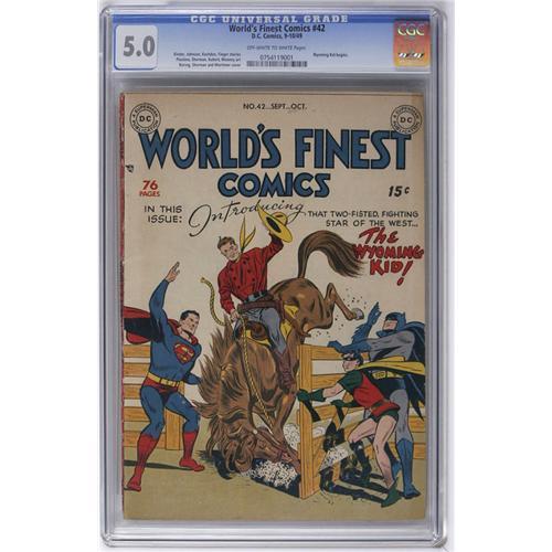 <B>World's Finest Comics #42 (DC, 1949) CGC VG/FN 5.0 Off-white to white pages.</B></I> Superman story with Al Plastino art. Batman story with Jim Mooney art. Zatara story with Joe Kubert art. First installment of Wyoming Kid backup feature. Cover by Wayne Boring, Howard Sherman, and Wayne Mortimer. Overstreet 2006 VG 4.0 value = $120; FN 6.0 value = $180. CGC census 1/06: 1 in 5.0, 4 higher. <I>From the Collection of Harold Curtis.</B></I>