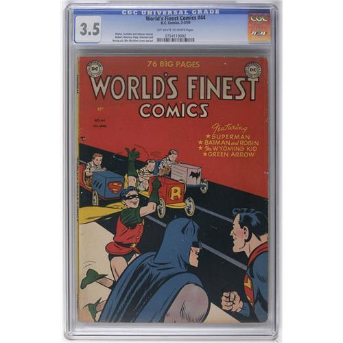 <B>World's Finest Comics #44 (DC, 1950) CGC VG- 3.5 Off-white to white pages.</B></I> Win Mortimer cover. Superman, Batman, Zatara, Green Arrow, and the Wyoming Kid appear. Overstreet 2006 VG 4.0 value = $120. CGC census 3/06: 1 in 3.5, 1 higher. <I>From the Collection of Harold Curtis.</B></I>