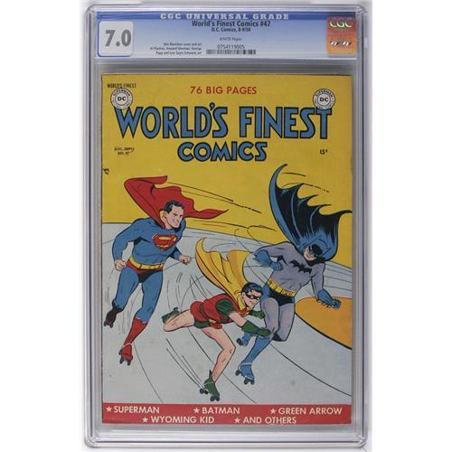 <B>World's Finest Comics #47 (DC, 1950) CGC FN/VF 7.0 White pages.</B></I> This is the only copy of this book certified with a grade above VG as of this writing! Win Mortimer's cover illustration is one of very few roller-skating covers we can remember seeing (not counting characters who had skates built into their costumes!). Superman and Batman are joined in this issue by Zatara the Magician, Green Arrow, and the Wyoming Kid. Overstreet 2006 FN 6.0 value = $180; VF 8.0 value = $375. CGC census 3/06: 1 in 7.0, none higher. <I>From the Collection of Harold Curtis.</B></I>