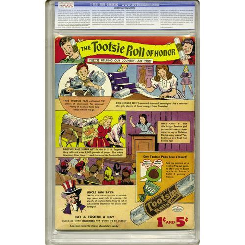 <B>World's Finest Comics #6 (DC, 1942) CGC VF- 7.5 Off-white pages.</B></I> Superman, Batman, and Robin greet a couple of America's fighting men on this patriotic red, white, and blue Fred Ray cover. Inside art is by Joe Simon and Jack Kirby (on the revamped Sandman and Sandy feature), along with Howard Sherman, John Sikela, Jerry Robinson, Harry Lampert, and others. Beginning this issue: Aquaman and the Star Spangled Kid. This copy is tied with two others as highest CGC-graded to date. Overstreet 2006 VF 8.0 value = $1,206. CGC census 5/06: 3 in 7.5, none higher. <BR><BR><B>Important notice:</B> Heritage usually auctions material at the rate of 200-250 lots per hour. On some occasions eBay Live bid software or the Internet may not be able to keep up with the pace of the auction. We recommend placing a realistic absentee bid now as insurance to avoid disappointment. Occasionally the auctioneer may eliminate or reject an eBay Live bid, and the auctioneer may also reopen a lot after the close of the eBay live bidding (usually because we missed an audience bid), and may reject your bid even if it shows you as the winning bidder. By bidding via eBay Live, you agree that Heritage may award the lot to another bidder at its sole discretion under the circumstances described above or any other reasonable circumstances. Since eBay bids are not shown to us until we open the lot on the floor, we treat those bids just like floor bids. In most cases the floor responds before the eBay bid is presented to us, due to Internet lag time, so for consistency we have made it a policy that floor bids are always considered first over tie eBay live bids. Also please note that all Heritage lots purchased through eBay Live carry a 22.5% Buyer's Premium. Please make sure you read the Terms and Conditions before you bid. This lot is being auctioned in conjunction with a live floor auction by Heritage Auction Galleries. All final auction and invoice information will be supplied by Heritage Auction Galleries, and all other information should be considered preliminary. Lot:41001 <BR><BR><B>Winning Notification and Billing:</B> After the FINAL session in this auction is complete, Heritage will send e-mail and snail mail invoices. This process normally takes several days. All final auction and invoice information will be supplied by Heritage Auction Galleries, and all other information should be considered preliminary. <BR><BR>This auction will be conducted on a live auction floor and over the Internet through eBay Live. If you choose to place an absentee bid, please take a moment to <font color='#0000ff'><u><a href='http://pages.ebay.com/liveauctions/help/before/laabsentee.html'>learn how eBay Live absentee bidding works</a></u></font><font color='#000000'>