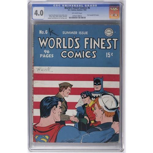 <B>World's Finest Comics #6 (DC, 1942) CGC VG 4.0 Off-white pages.</B></I> While the original "gas mask" Sandman had appeared in the previous three issues, this book has the new "superhero" Sandman. And yes, funnybook fans, that means the dynamic art of Simon and Kirby is seen in these pages! This book also has the Star-Spangled Kid's debut in this title as well as the only Aquaman story of the series' entire Golden Age run. And let's not forget the book's stars, Batman and Superman, or the great patriotic cover by Fred Ray. Overstreet 2006 VG 4.0 value = $386. CGC census 3/06: 1 in 4.0, 10 higher. <I>From the Collection of Harold Curtis.</B></I>