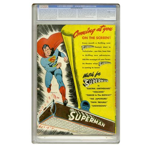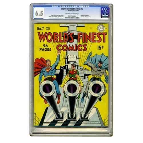 <B>World's Finest Comics #7 (DC, 1942) CGC FN+ 6.5 Off-white to white pages.</B></I> Here's DC's "big guns" -- Superman, Batman, and Robin -- on a great Jack Burnley battleship cover from World War II. Green Arrow begins with this issue, which also includes Sandman by Joe Simon and Jack Kirby. Of special interest is the back cover advertisement promoting the Superman cartoon series by Max Fleischer. Overstreet 2005 FN 6.0 value = $576; VF 8.0 value = $1,200. CGC census 11/05: 5 in 6.5, 11 higher.