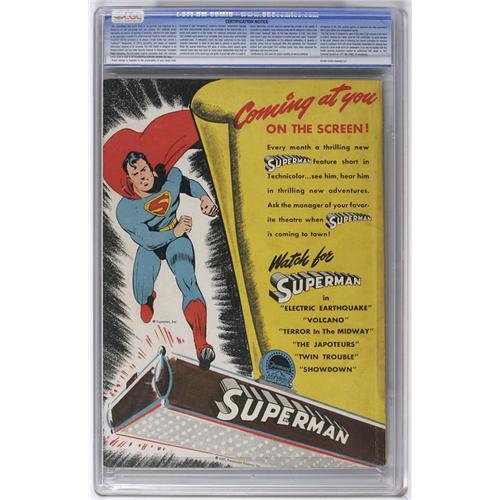<B>World's Finest Comics #7 (DC, 1942) CGC VF- 7.5 Off-white to white pages.</B></I> The new "superhero-style" Sandman appears in this issue, and if that statement has you crossing your fingers that Simon and Kirby did the art, we're happy to report that is indeed the case. The Jack Burnley cover alone makes this one well worth a bid! The back cover ad is noteworthy too, as it's a full-page plug for the Paramount Superman movies. Overstreet 2006 VF 8.0 value = $1,206. CGC census 3/06: 2 in 7.5, 5 higher. <I>From the Collection of Harold Curtis.</B></I>