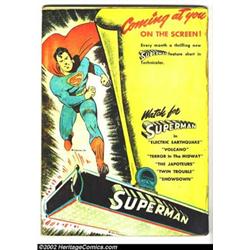 World's Finest Comics #7 (DC, 1942) Condition: Apparent FR. Here is one of the most classic of all covers from the Golden Age. Batman, Robin and Superman are all perched atop the battleship cannons on this World War II issue. This book has amateur color touch on front and back cover. The first page has some tape, and the last page has a 1" chunk out of the middle of the page, with tape stains. The pages are supple and creamy. Overstreet 2002 GD 2.0 value = $191. Important notice: We expect to be auctioning lots at the rate of 200-250 per hour. Sometimes eBay Premier live bid software cannot keep up with that pace, so we strongly recommend that you place a realistic proxy bid now as insurance to avoid disappointment. Also please note that all Heritage/CAA lots purchased through eBay Premier carry a 20% Buyer's Premium. Please make sure you read the Terms and Conditions.