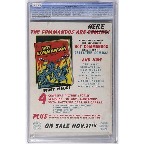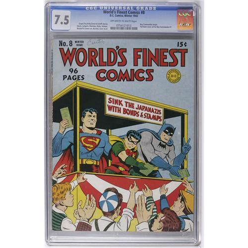 <B>World's Finest Comics #8 (DC, 1942) CGC VF- 7.5 Off-white to white pages.</B></I> A morale-boosting "buy war bonds" cover by Jack Burnley graces this issue, and the "Japanazis" are the designated foe -- that weenie Mussolini didn't even earn a mention! Meanwhile, Simon and Kirby's Boy Commandos made their series debut in this issue. Overstreet 2006 VF 8.0 value = $1,138. CGC census 3/06: 2 in 7.5, 3 higher. <I>From the Collection of Harold Curtis.</B></I>