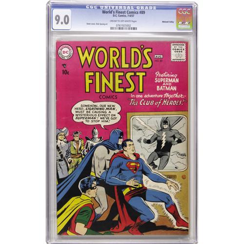<B>World's Finest Comics #89 Mohawk Valley pedigree (DC, 1957) CGC VF/NM 9.0 Cream to off-white pages.</B></I> What was the first Silver Age DC superhero group? Theories abound, but how about the Club of Heroes, which far pre-dated the Justice League! They're the same group as the Batmen of All Nations seen in <B>Detective</B></I> #215. Curt Swan drew the issue's cover. Comes with the Mohawk Valley certificate of authenticity. Overstreet 2006 VF/NM 9.0 value = $337; NM- 9.2 value = $460. CGC census 9/06: 1 in 9.0, none higher.<BR><BR><b>Shipping:</b> Slabbed Comic (<a target="_blank" href="http://www.heritageauctions.com/common/shipping.php">view shipping information</a>)