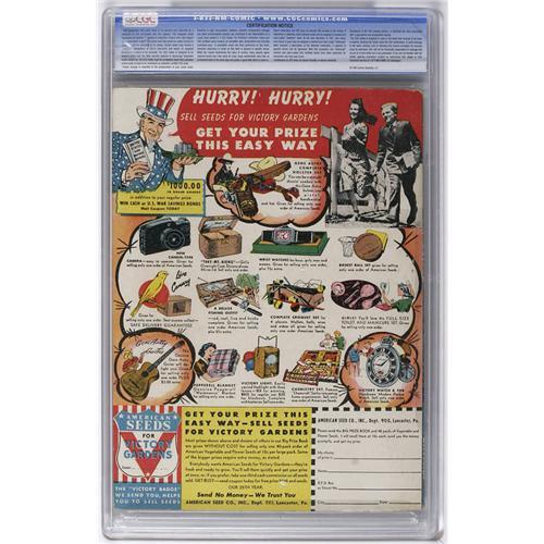 <B>World's Finest Comics #9 (DC, 1943) CGC VF+ 8.5 Off-white to white pages.</B></I> Here's one of the highlights of this high-grade run, it's the sole highest-graded copy as of this writing. Hitler, Tojo, and Mussolini are featured on this Jack Burnley cover. A Boy Commandos story with Simon and Kirby art is the standout feature. While Batman and Superman appeared in separate stories in this and every issue, the Caped Crusader does put in a cameo in the Star-Spangled Kid story, as do Robin and the Joker! Alas, this was the last of the 100-page issues (if it's any consolation, they were all just 96-pagers anyway if you don't count the covers!). Note that a small plastic stabilizing peg is loose inside the CGC holder, not affecting the comic itself or the integrity of the holder. Overstreet 2006 VF 8.0 value = $1,275; VF/NM 9.0 value = $2,013. CGC census 3/06: 1 in 8.5, none higher. <I>From the Collection of Harold Curtis.</B></I>