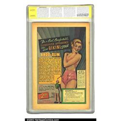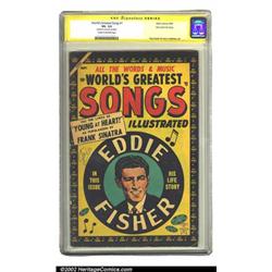 World's Greatest Songs #1 Stan Lee File Copy (Atlas, 1954) CGC VG- 3.5 Cream to off-white pages. Signature Series. This scarce early Atlas issue features the life story of Eddie Fisher, plus gives you lyrics to Frank Sinatra's song "Young at Heart." With this copy being difficult to find at any time, the fact that this is Stan Lee's file copy and is signed by him makes it that much more desirable. Overstreet 2002 GD 2.0 value = $40; FN 6.0 value = $120. Important notice: We expect to be auctioning lots at the rate of 200-250 per hour. Sometimes eBay Premier live bid software cannot keep up with that pace, so we strongly recommend that you place a realistic proxy bid now as insurance to avoid disappointment. Also please note that all Heritage/CAA lots purchased through eBay Premier carry a 20% Buyer's Premium. Please make sure you read the Terms and Conditions.
