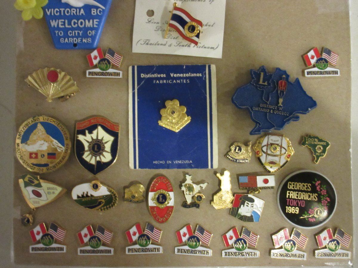 Around the World with Lions Club collector pins from Thailand South Vietnam, South Africa, Switzerland, Brazil, Anjou Minami, New Zealand, Finland, India, Japan, Philippines, District Ontario/ Quebec, Venezuela