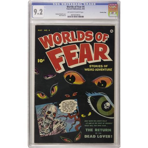 <B>Worlds of Fear #4 Crowley Copy pedigree (Fawcett, 1952) CGC NM- 9.2 Off-white to white pages.</B></I> Sheldon Moldoff provides the cover for this issue, and Bob Powell the art. The mostly black cover is in superb condition. This is the highest graded copy certified by CGC to date, and the first we've ever had the opportunity to offer. Overstreet 2006 NM- 9.2 value = $440. CGC census 10/06: 1 in 9.2, none higher.<BR><BR><b>Shipping:</b> Slabbed Comic (<a target="_blank" href="http://www.heritageauctions.com/common/shipping.php">view shipping information</a>)