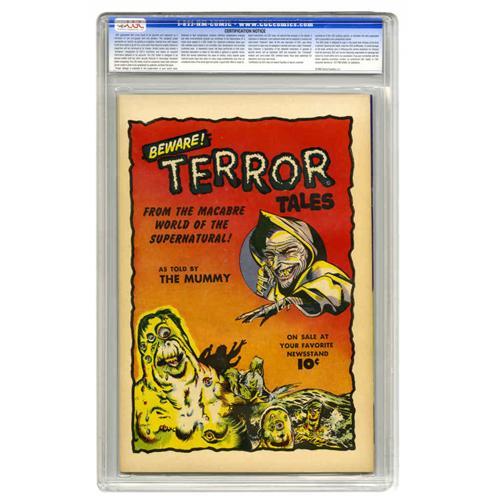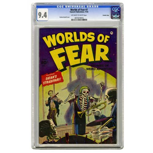 <B>Worlds of Fear #7 Crowley Copy pedigree (Fawcett, 1952) CGC NM 9.4 Off-white to white pages.</B></I> It's horror and violence... no, wait, horror and <I>violins</B></I>! Either way, we've got the highest-graded copy certified to date of this pre-Code horror book. Overstreet 2005 NM- 9.2 value = $375. CGC census 12/05: 1 in 9.4, none higher.