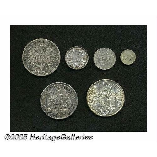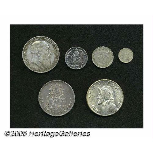 <B>Worldwide Assortment, </B></I>Curacao Stuiver token KM-Tn2, VF, Germany-Baden 5 Mark 1907G, toned VF, Guadeloupe 50 Centimes 1903, porous VF, Mexico Balance Scale Peso 1873-Oa-E, toned XF, Panama Balboa 1931, choice toned UNC, and Switzerland Franc 1904, toned XF, very scarce. <B>Sold as is, no return lot.</B></I>
